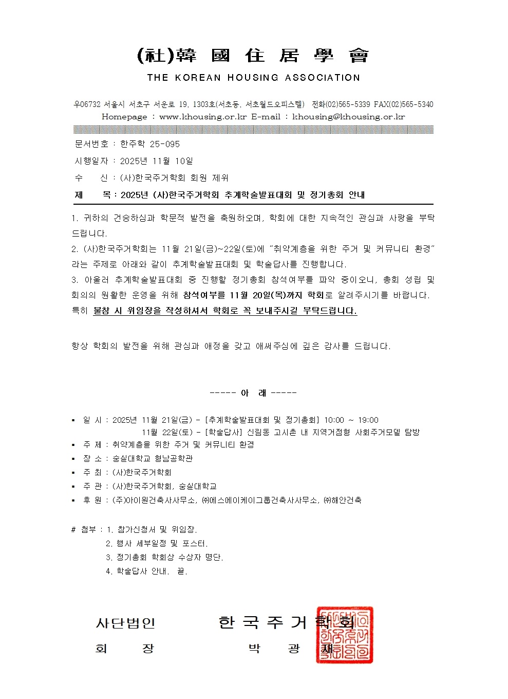 3. 아울러 추계학술발표대회 중 진행될 정기총회에서는 2025년 학회상 시상식과 결산 및 연구/사업보고, 예산 및 연구/사업계획에 관한 승인이 이루어질 예정입니다.