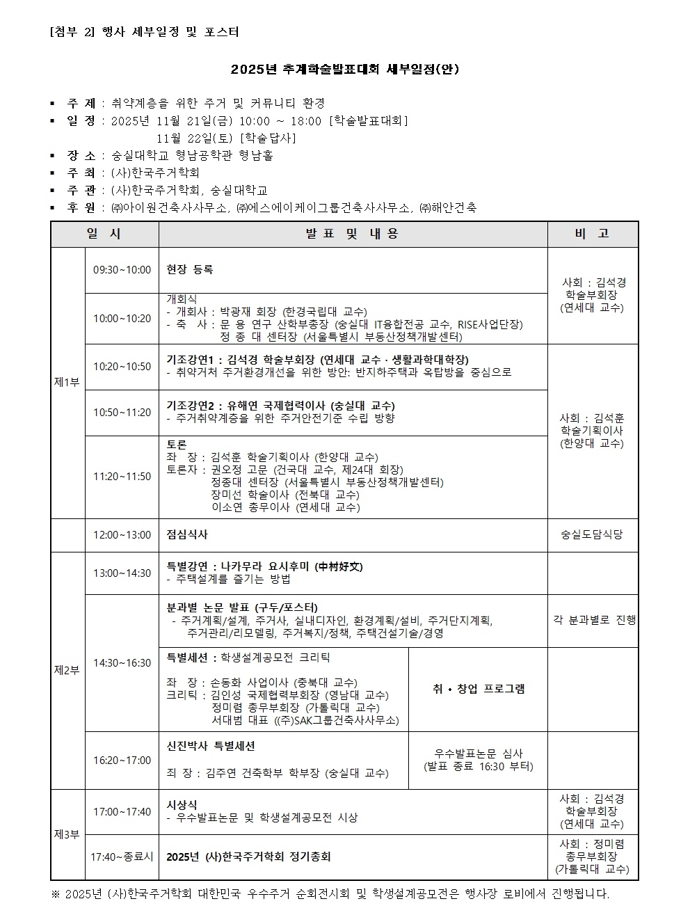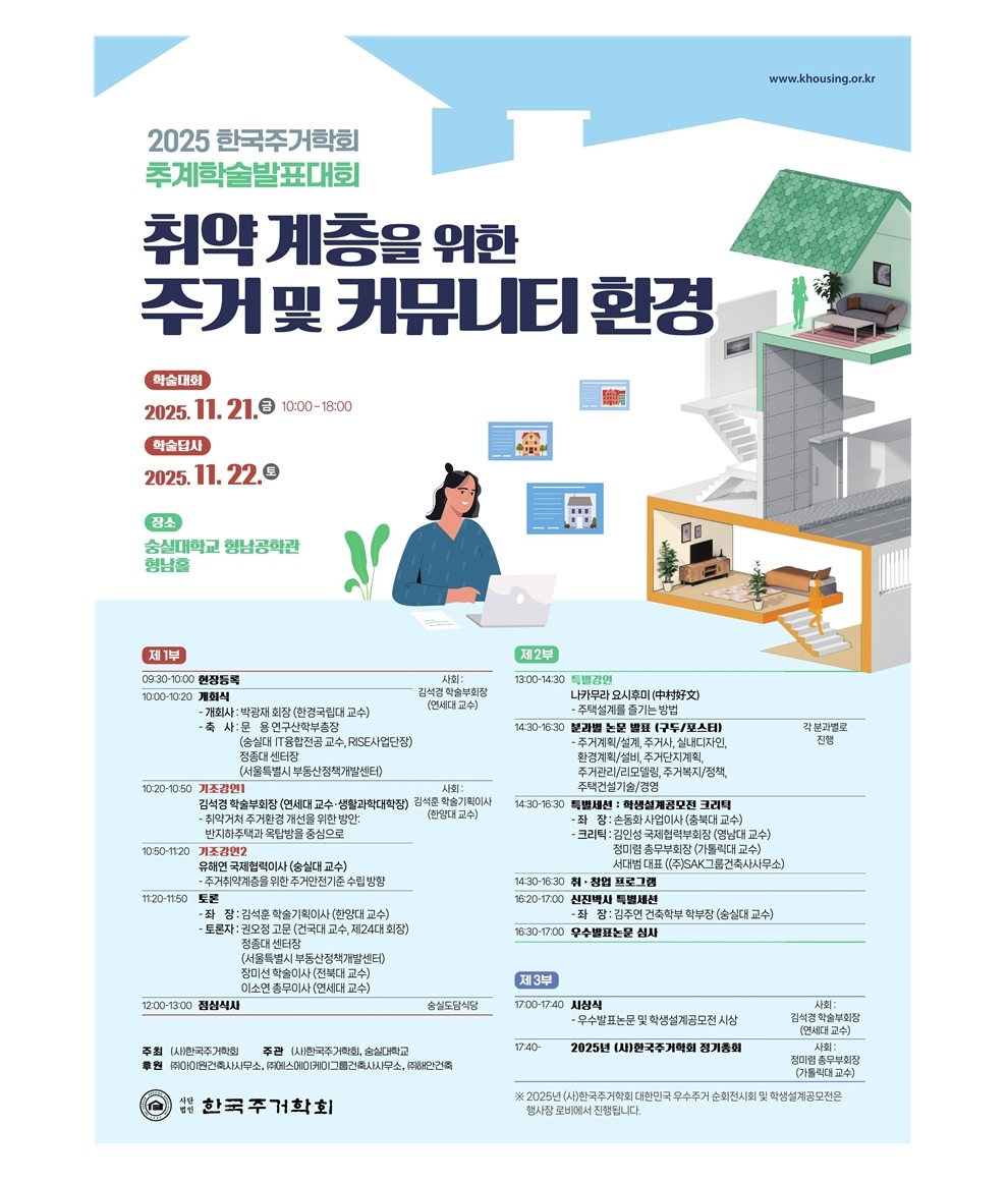 2. (사)한국주거학회는 11월 21일(금)~22일(토)에 “취약계층을 위한 주거 및 커뮤니티 환경”라는 주제로 아래와 같이 추계학술발표대회 및 학술답사를 진행합니다.