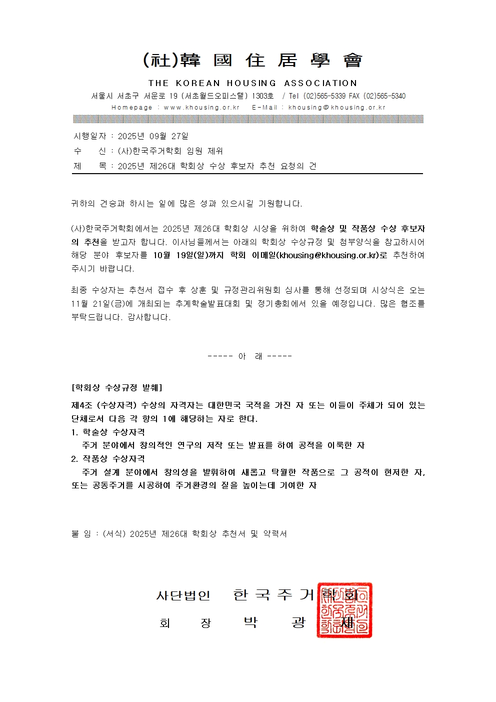 (사)한국주거학회에서는 2025년 제26대 학회상 시상을 위하여 학술상 및 작품상 수상 후보자의 추천을 받고자 합니다. 이사님들께서는 아래의 학회상 수상규정 및 첨부양식을 참고하시어 해당 분야 후보자를 10월 19일(일)까지 학회 이메일(khousing@khousing.or.kr)로 추천하여 주시기 바랍니다.