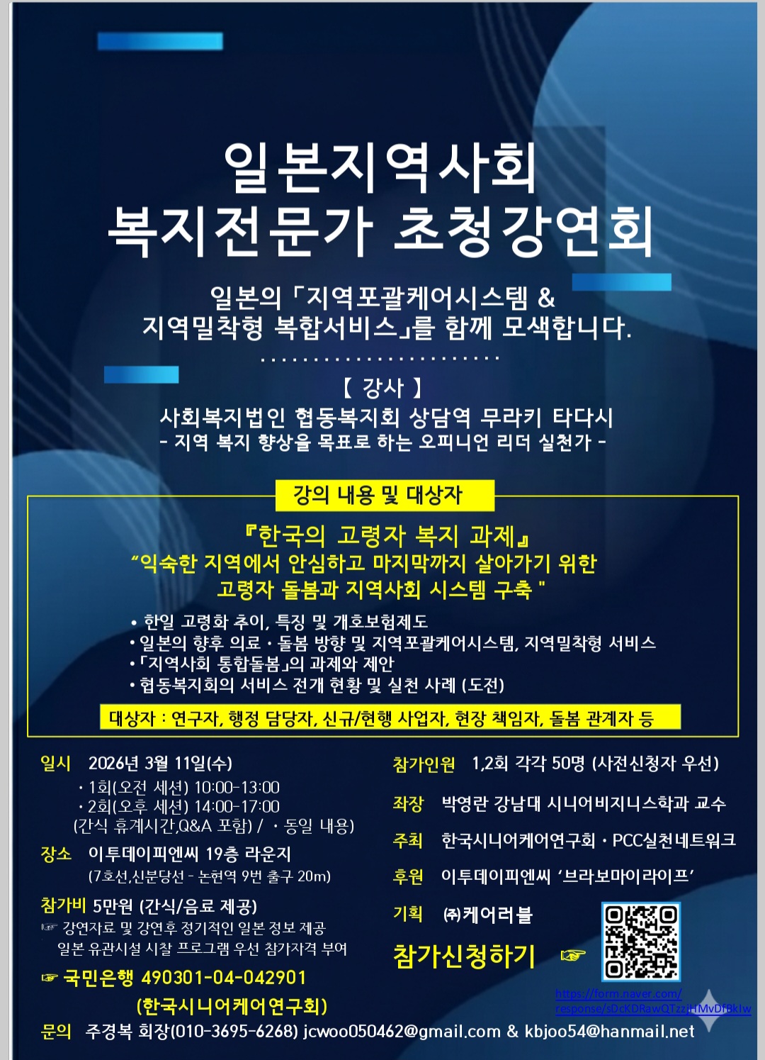 | [한국시니어케어연구회 · PCC실천네트워크] 일본 지역사회 복지전문가 초청강연회 |