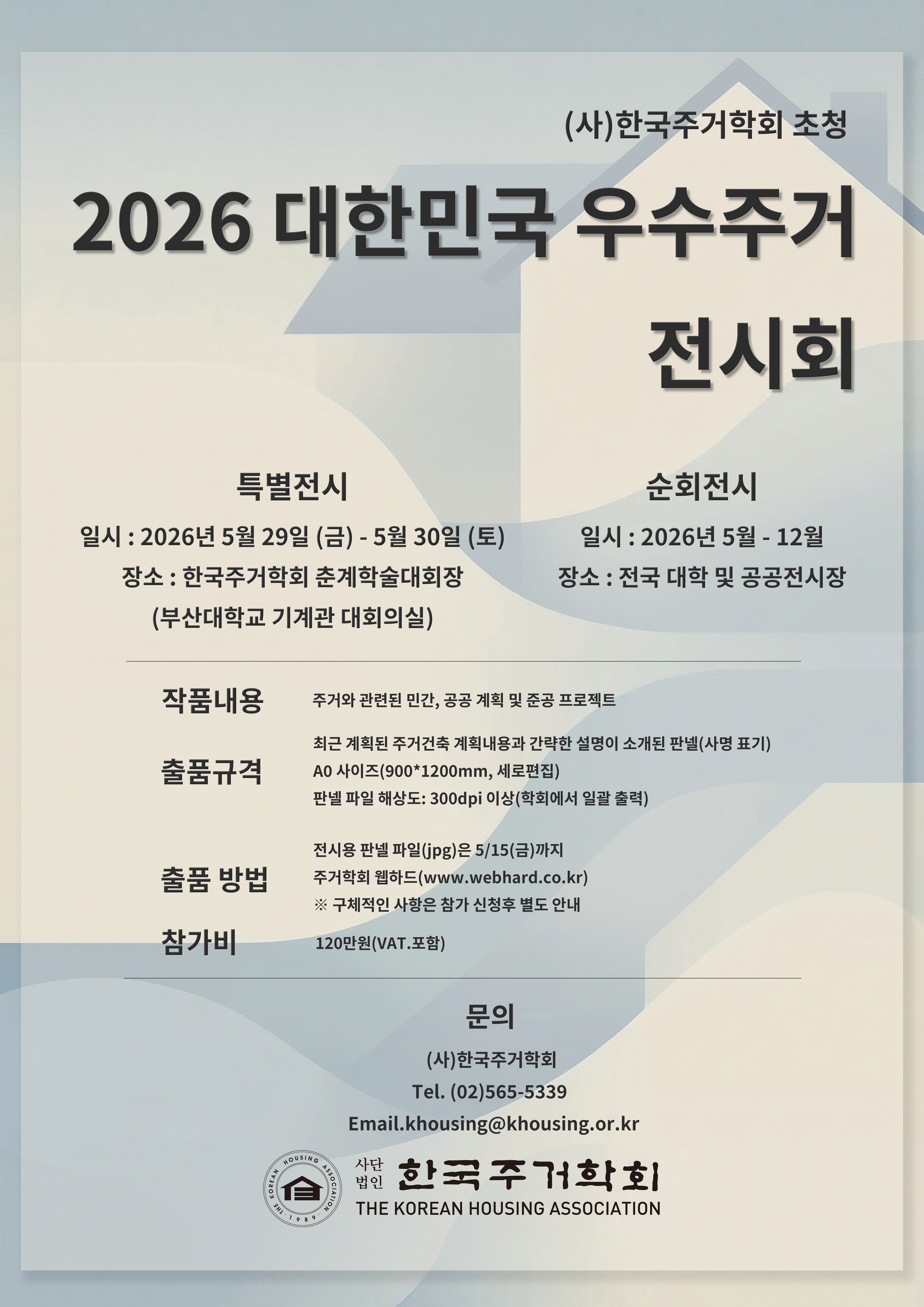 (사단법인) 한국주거학회가 주최하는 “2026년 대한민국 우수주거 전시회”에 귀사의 작품을 ‘대한민국 우수주거’로 초청하오니 참여와 후원을 부탁드립니다.